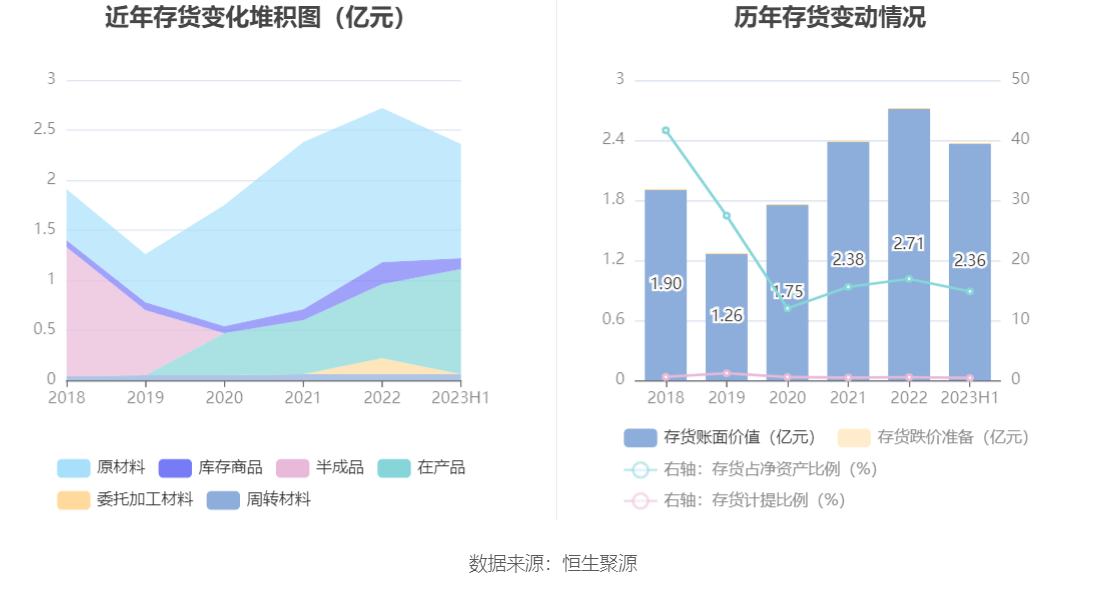从存货变动来看,截至2023年上半年末,公司存货账面价值为2.36亿元,占净资产的14.79%,较上年末减少3500.56万元。其中,存货跌价准备为89.05万元,计提比例为0.38%。