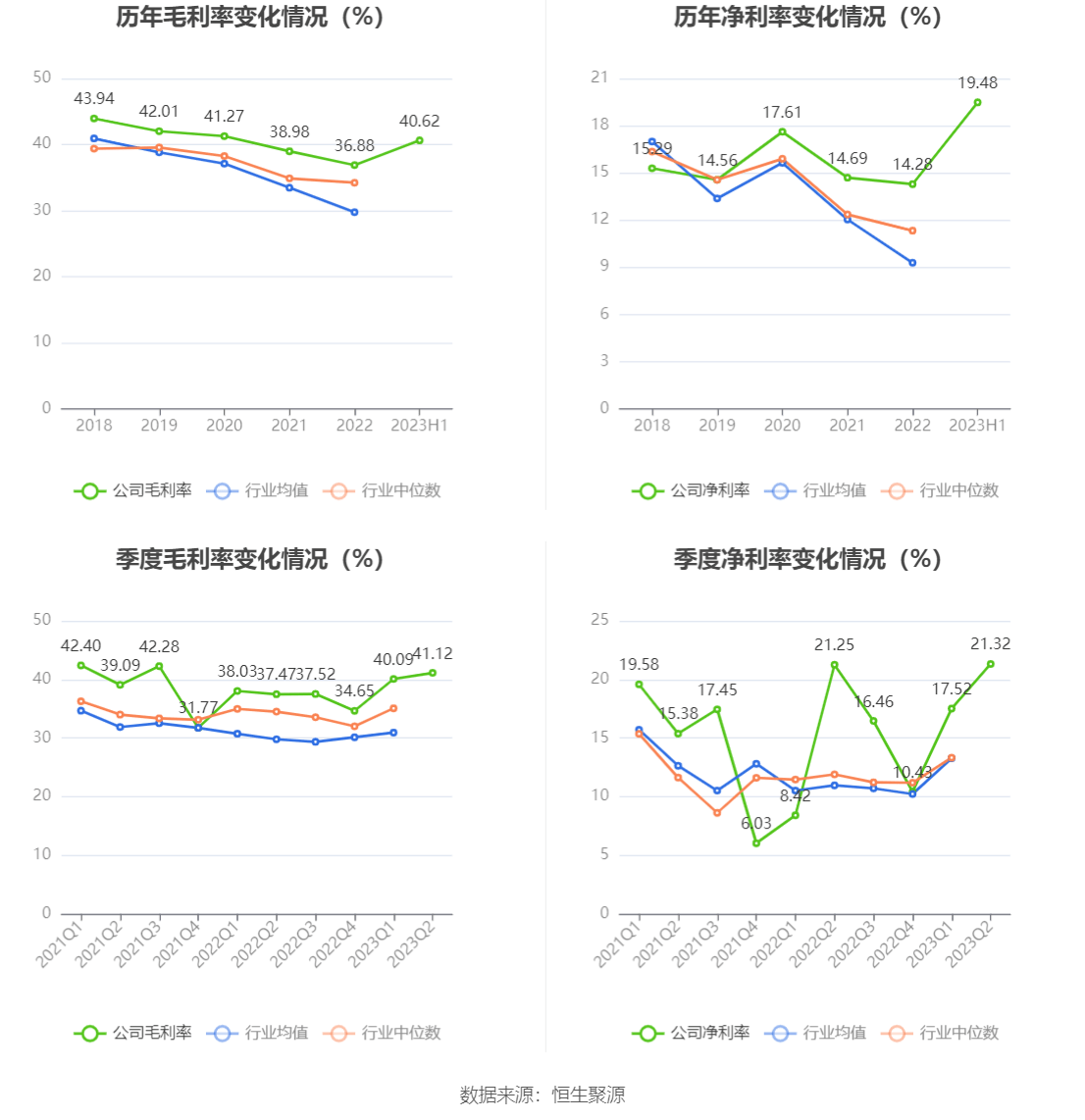 2023年上半年,公司毛利率为40.62%,同比上升2.88个百分点;净利率为19.48%,较上年同期上升4.35个百分点。从单季度指标来看,2023年第二季度公司毛利率为41.12%,同比上升3.65个百分点,环比上升1.03个百分点;净利率为21.32%,较上年同期上升0.07个百分点,较上一季度上升3.80个百分点。