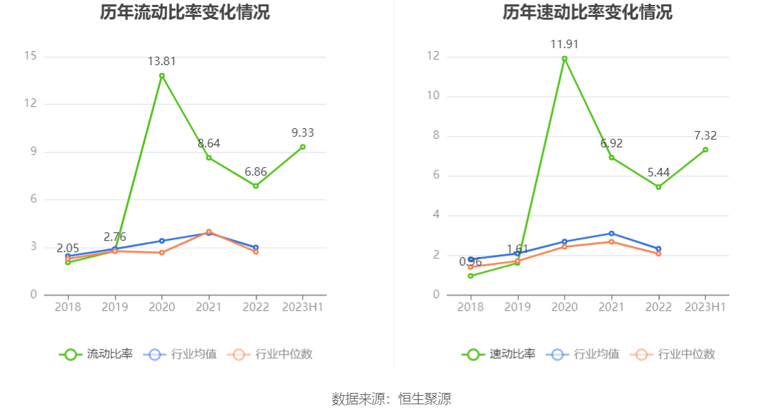 2023年上半年,公司流动比率为9.33,速动比率为7.32。