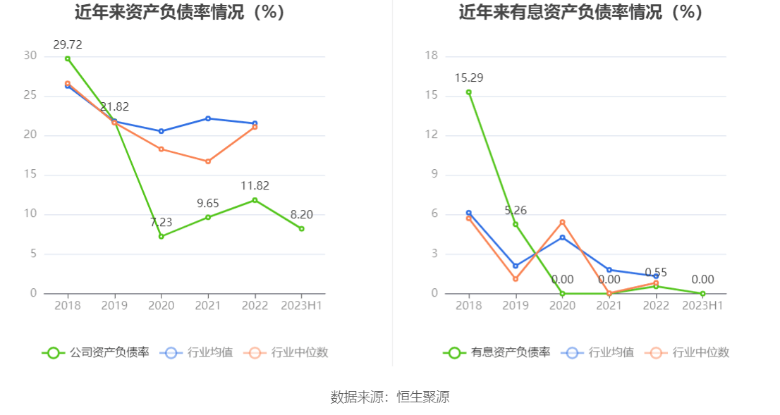 偿债能力方面,公司2023年二季度末资产负债率为8.20%,相比上年末减少3.62个百分点;有息资产负债率为0.00%,相比上年末减少0.55个百分点。