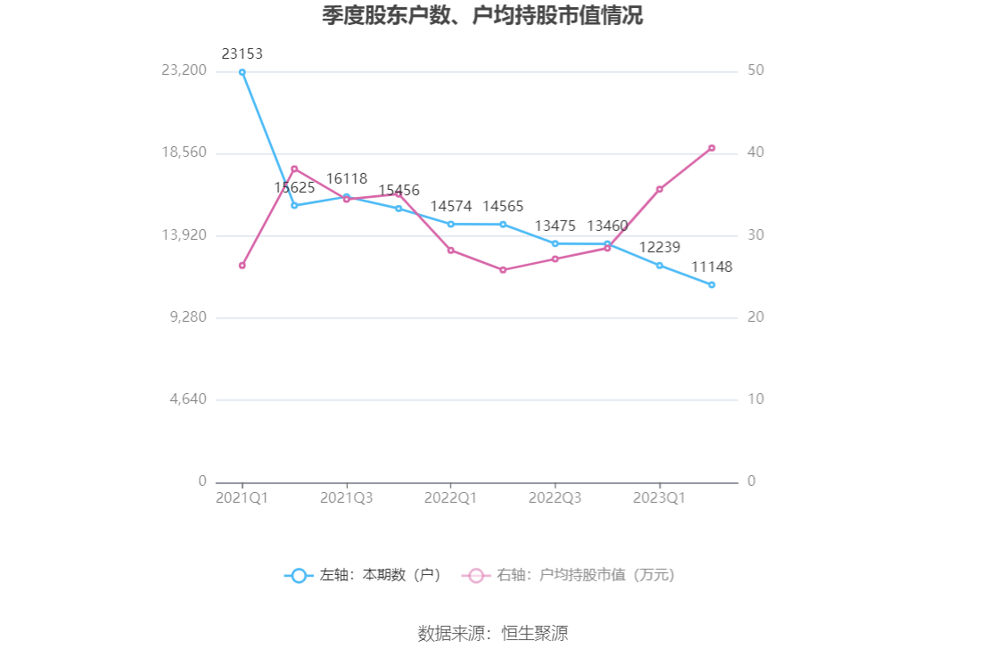 筹码集中度方面,截至2023年二季度末,公司股东总户数为1.11万户,较一季度末下降了1091户,降幅8.91%;户均持股市值由一季度末的35.66万元上升至40.68万元,增幅为14.08%。