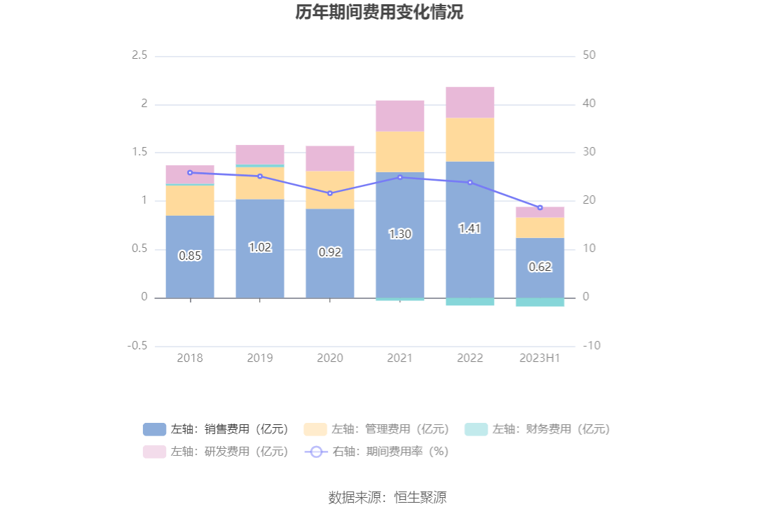 2023年上半年,公司期间费用为8574.47万元,较上年同期减少2246.31万元;期间费用率为18.65%,较上年同期下降7.32个百分点。其中,销售费用同比下降22.31%,管理费用同比下降1.48%,研发费用同比下降5.36%,财务费用由去年同期的-504.43万元变为-882.29万元。