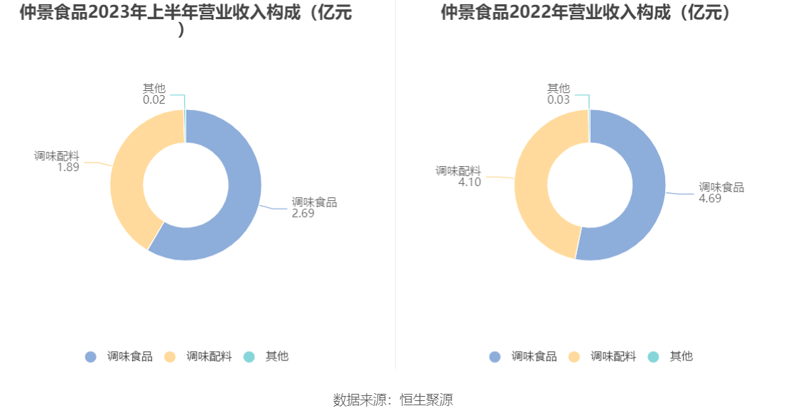 分产品来看,2023年上半年公司主营业务中,调味食品收入2.69亿元,同比增长12.94%,占营业收入的58.47%;调味配料收入1.89亿元,同比增长6.71%,占营业收入的41.16%。
