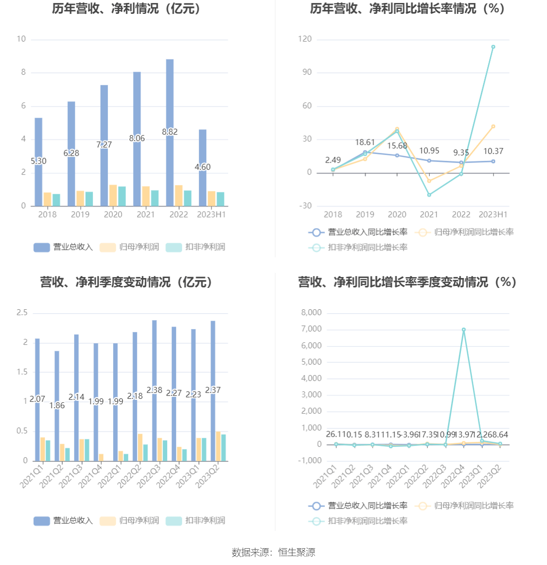 根据半年报,公司第二季度实现营业总收入2.37亿元,同比增长8.64%,环比增长6.04%;归母净利润5046.17万元,同比增长8.93%,环比增长29.08%;扣非净利润4515.58万元,同比增长63.48%,环比增长16.87%。