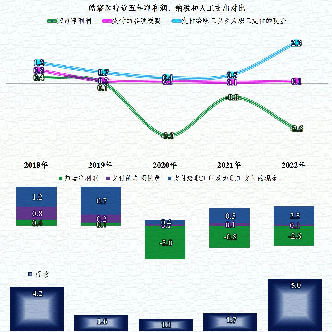 皓宸医疗的变化较大,主要原因是其中间三年的营收萎缩严重,在2018年时,其薪酬类支出是税收和净利润之和,然后连续就是微利和亏损,2022年的情况看起来就不太了乐观了。