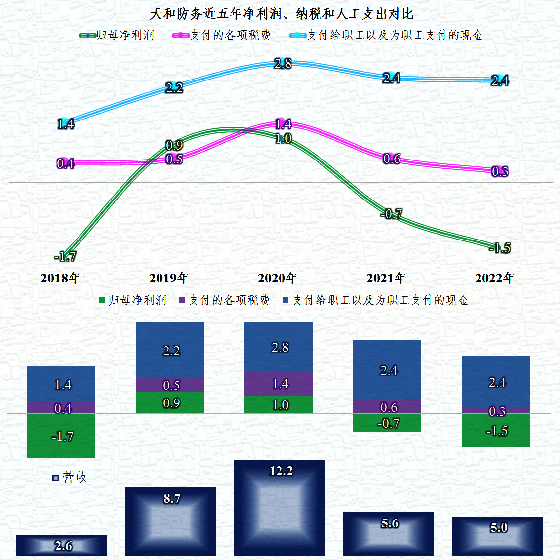 天和防务的情况是在2020年营收达到过12.2亿元的高点,然后调整向下,其三项支出也和营收一样,是一条抛物线。只是薪酬类支出的抛物线更平缓地位于顶部;税收平均一些,位于中间;净利润大起大落,但总体上经营形势不容乐观。