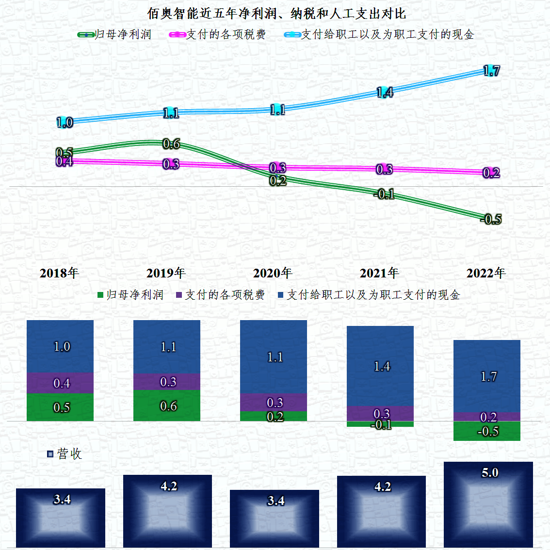 佰奥智能也算是增长期的企业,只是增长相对较慢,中间还有起伏。其薪酬类支出也是稳步上升的,增长幅度超过了营收增长幅度;税收稳中有降,但最近两年却出现了亏损。