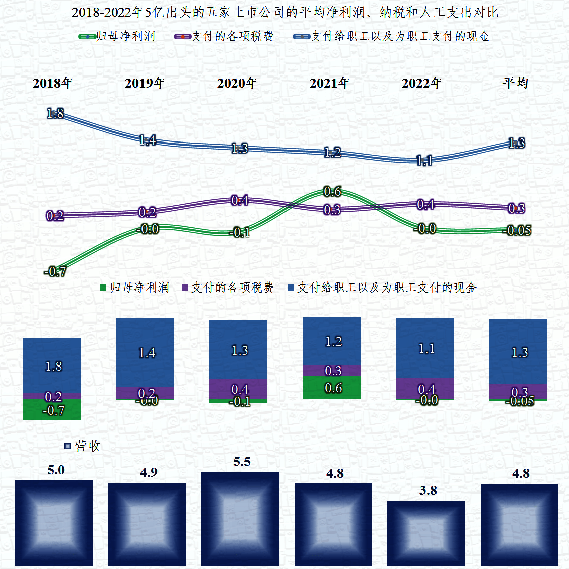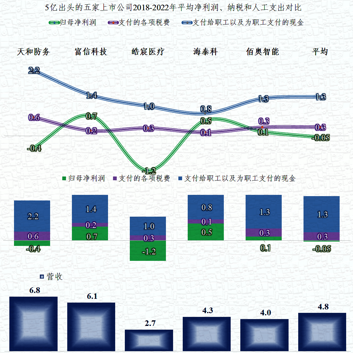 为了降低各年的波动,我们把这五家公司的五年数据进行了平均。薪酬类支出都是各家中最大的项目,富信科技和海泰科的净利润是超过税收贡献的,另外三家都是低于税收贡献的。总平均后,五家企业五年基本保本,平均薪酬支出了1.3亿元,税收贡献了3000万元。