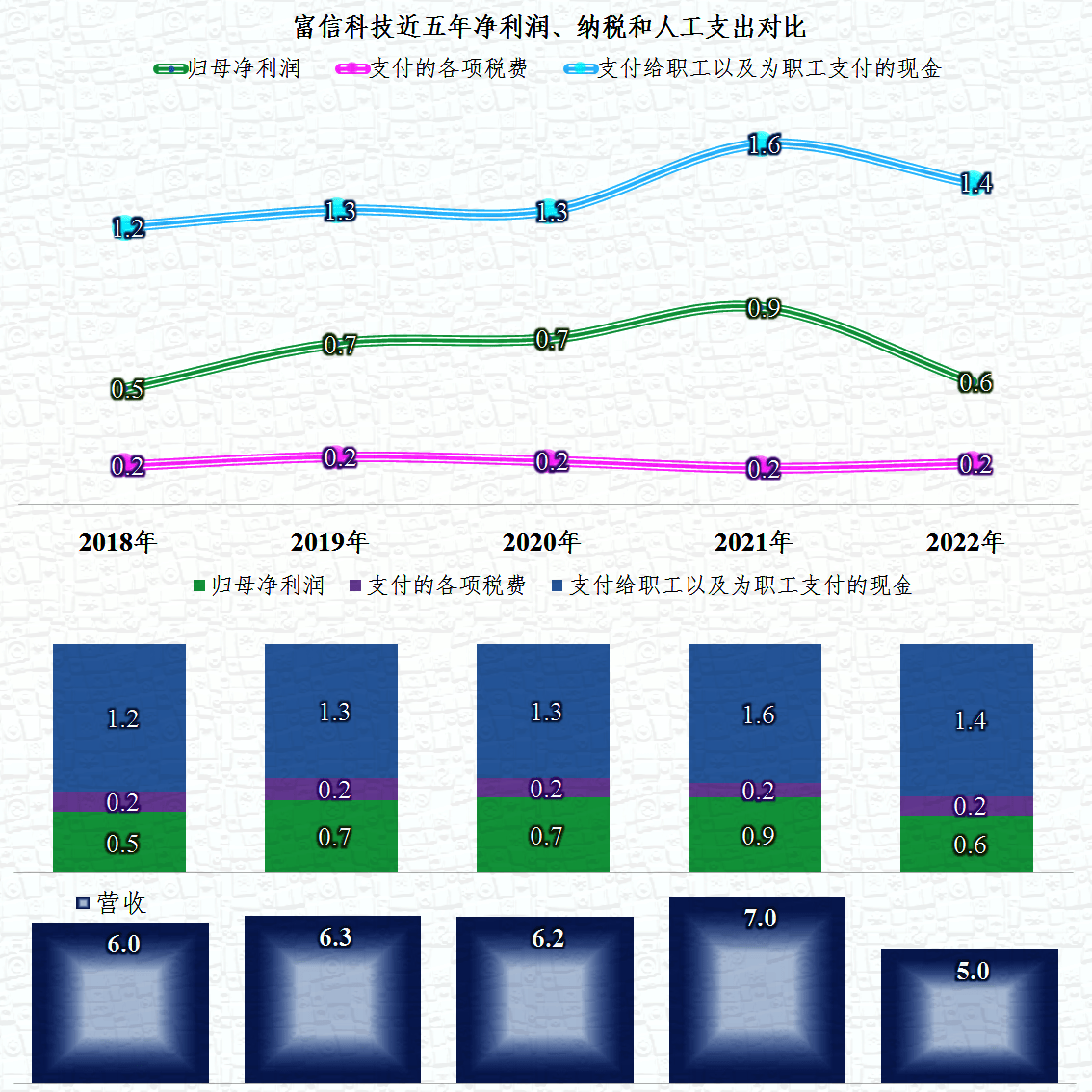 富信科技的表现相当平稳,三条支出线从不相交,距离还比较大。薪酬类支出虽然有波动,但总体上仍然是增长状态;盈利能力相对稳定,总体上也呈增长状态;税收最为平稳,且负担相对较低。只是2022年只有税收稳住了,其他两项都有明显回调。
