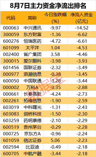 今日有9股主力净流出超3亿元,其中中兴通讯、东方财富、恒瑞医药主力净流出居前。