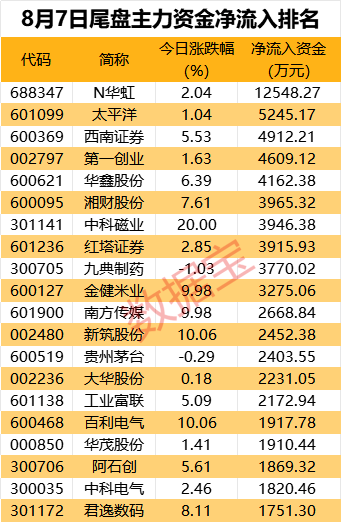 个股方面,N华虹尾盘主力抢筹超1亿元,太平洋、西南证券、第一创业、华鑫股份尾盘主力抢筹均超4000万元。