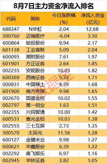 从个股看,沪深两市21股主力资金流入超1亿元。N华虹、迈瑞医疗、哈投股份、工业富联均获主力抢筹超2亿元。