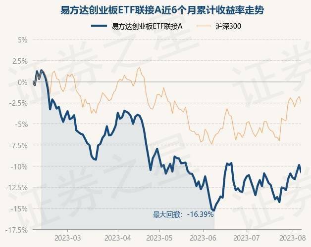 8月7日,易方达创业板ETF联接A最新单位净值为2.2883元,累计净值为2.2883元,较前一交易日下跌0.95%。历史数据显示该基金近1个月上涨3.11%,近3个月下跌0.76%,近6个月下跌10.76%,近1年下跌15.52%。该基金近6个月的累计收益率走势如下图: