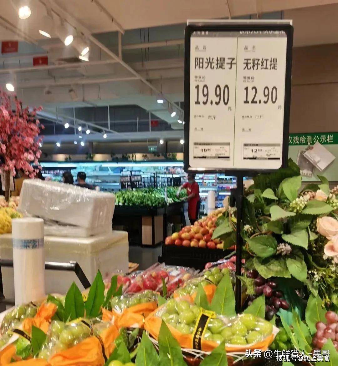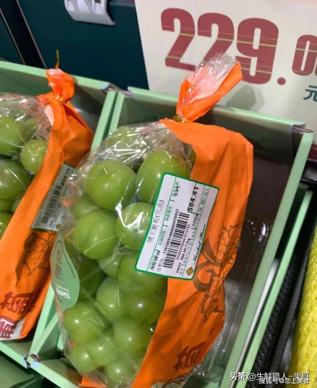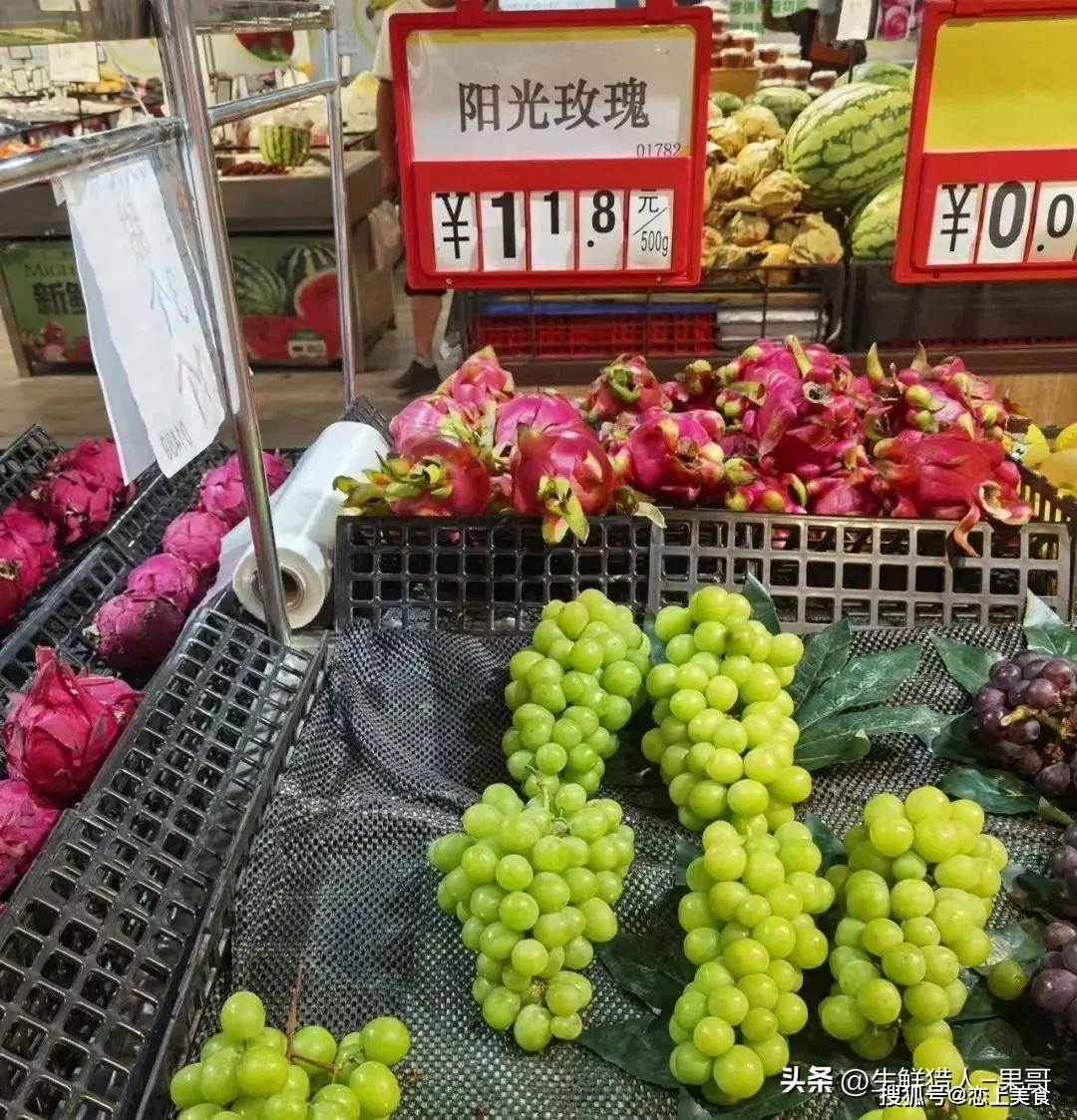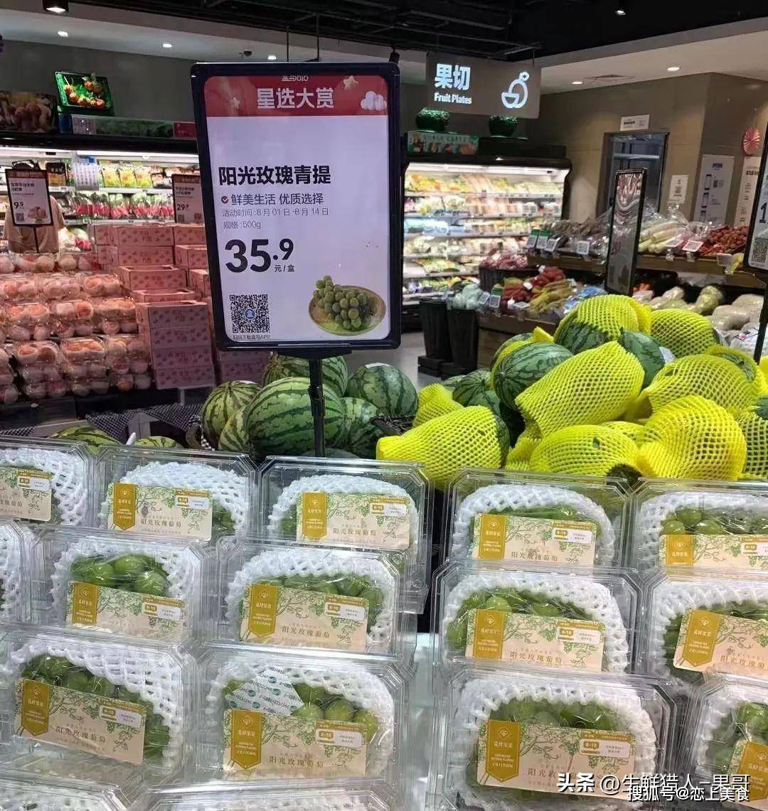 不过目前在高端商超,这个价格依然稳居在列,比如BHG超市现在的阳光玫瑰依然是229元/500g的价格。但是,离开了高端属性的超市,价格可谓是一波三折,一折更比一折低了。