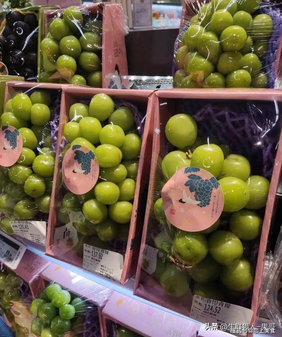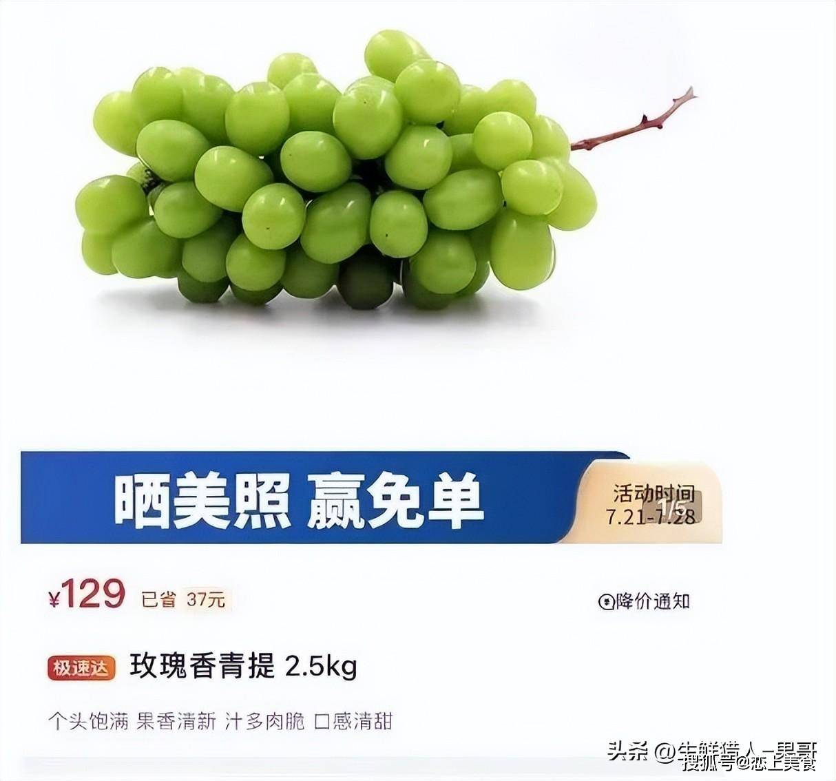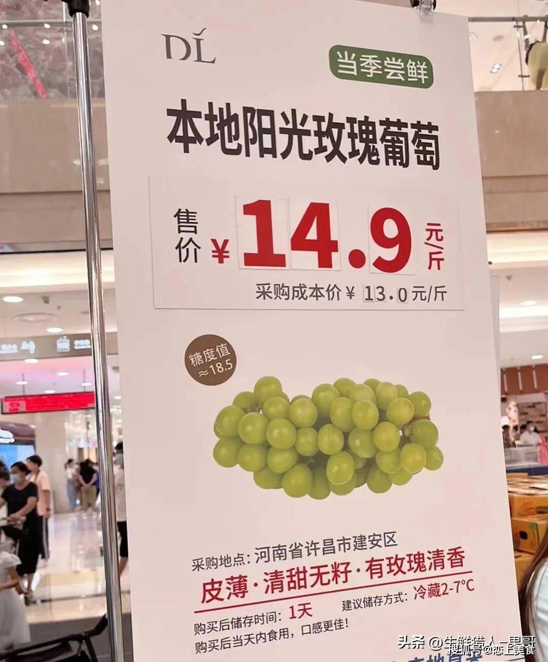 不过目前在高端商超,这个价格依然稳居在列,比如BHG超市现在的阳光玫瑰依然是229元/500g的价格。但是,离开了高端属性的超市,价格可谓是一波三折,一折更比一折低了。