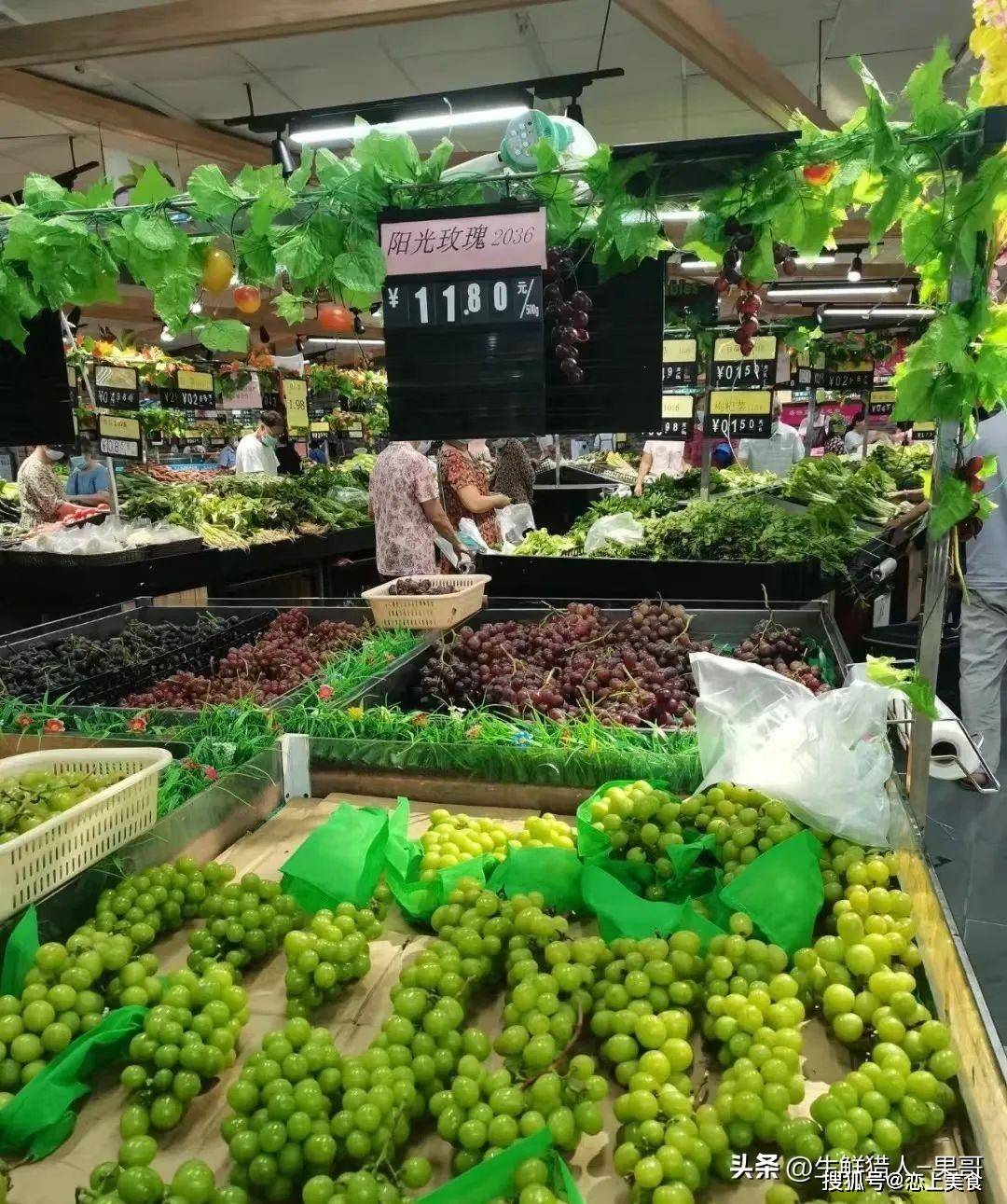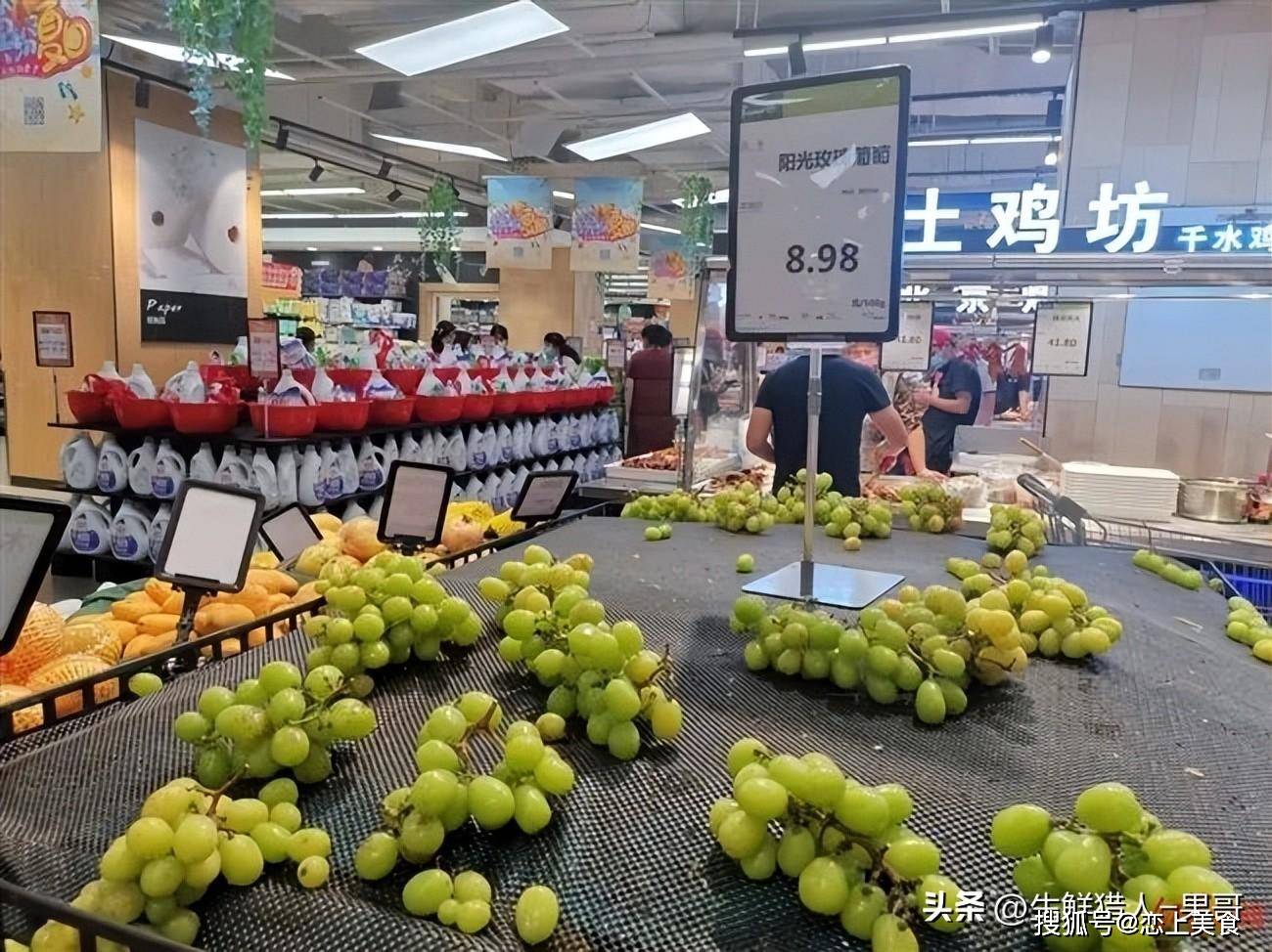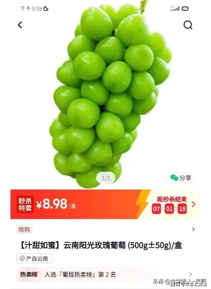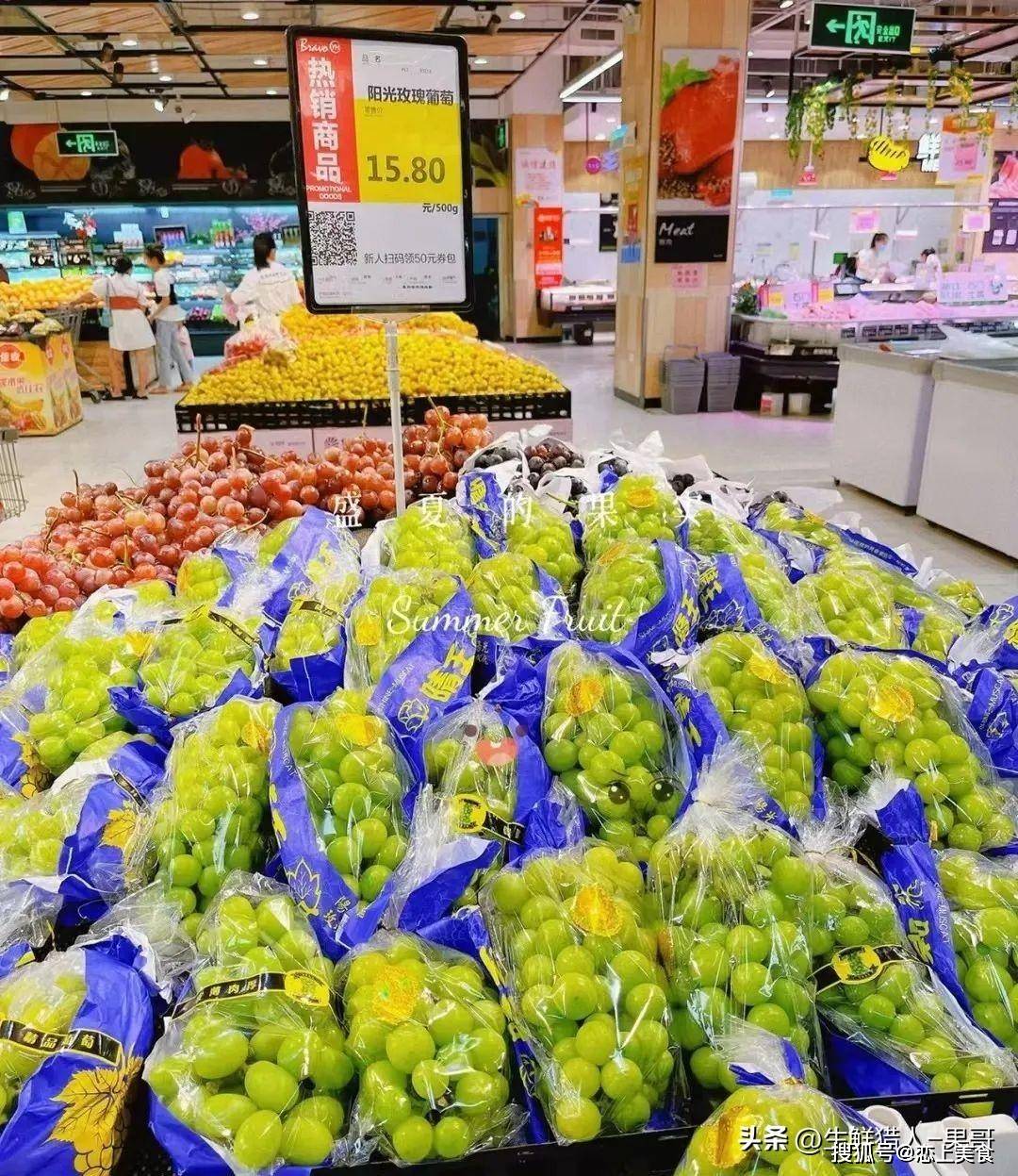 不过目前在高端商超,这个价格依然稳居在列,比如BHG超市现在的阳光玫瑰依然是229元/500g的价格。但是,离开了高端属性的超市,价格可谓是一波三折,一折更比一折低了。