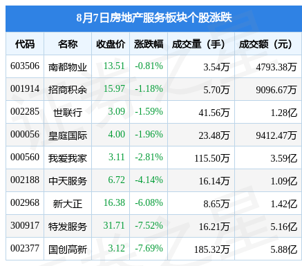8月7日房地产服务板块较上一交易日下跌2.79%,国创高新领跌。当日上证指数报收于3268.83,下跌0.59%。深证成指报收于11145.03,下跌0.83%。房地产服务板块个股涨跌见下表: