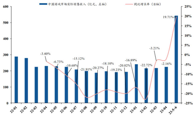 而从数据来看,游戏行业景气度仍在回升。7月31日,第二十届China Joy在上海落幕。会上发布的《2023年1-6月中国游戏产业报告》显示,上半年国内游戏市场实际销售收入规模为1442.63亿元,同比下降2.39%,环比增长22.16%,对应5~6月同比增长20%。上半年收入同比下降主要是用户消费意愿及消费能力1~4月尚未恢复,5月后市场收入出现较大增幅。