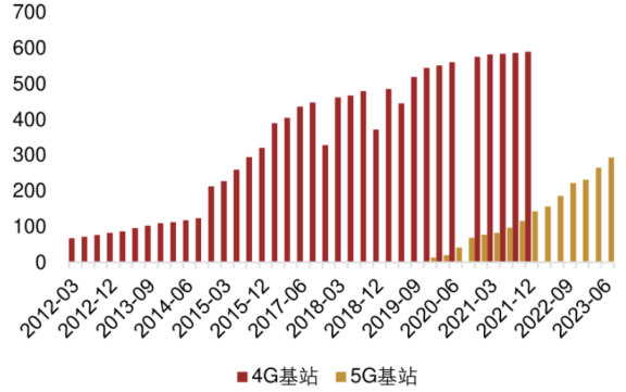 中国4G和5G基站数(单位:万站),来源:Wind、招商证券