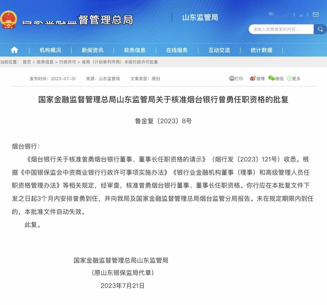 日前,国家金融监督管理总局山东监管局披露的最新行政许可显示,根据《中国银保监会中资商业银行行政许可事项实施办法》《银行业金融机构董事(理事)和高级管理人员任职资格管理办法》等相关规定,经审查,核准曾勇烟台银行董事、董事长任职资格。批复时间2023年7月21日。