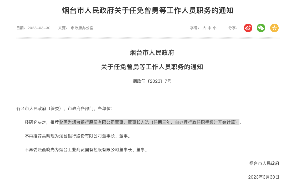 今年3月30日,烟台市发布任免通知称,经研究决定,推荐曾勇为烟台银行董事、董事长人选(任期三年,自办理行政任职手续时开始计算)。不再推荐吴明理为烟台银行董事长、董事。根据烟台银行2022年报信息,吴明理的年龄为59岁,此番交接,或因年龄原因退休。