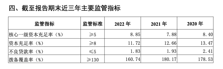 从不良率指标来看,烟台银行近年来持续下降。财报显示,2020年至2022年,该行不良率分别为2.41%、1.93%、1.83%。2022年,烟台银行核心一级资本净额66.54亿元,核心一级资本充足率8.85%。