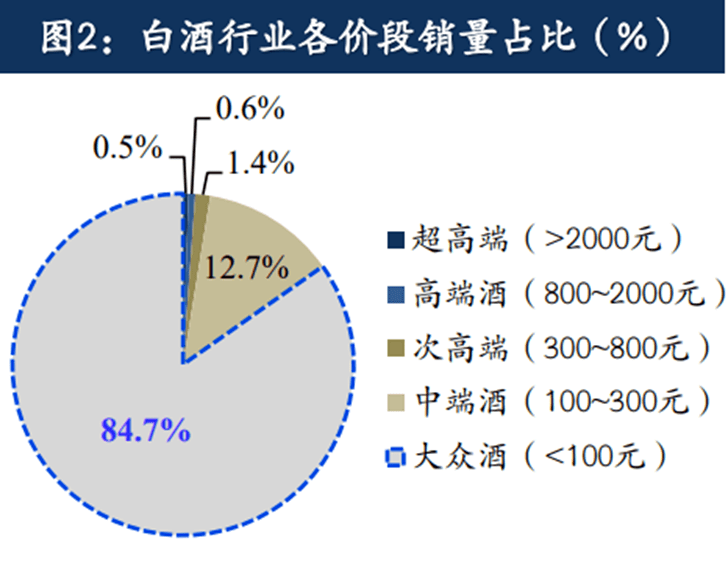 但如考虑到价格差距,相比动辄300元-500元的次高端白酒,按销量算,低于100元的大众酒,占有接近85%的市场份额。