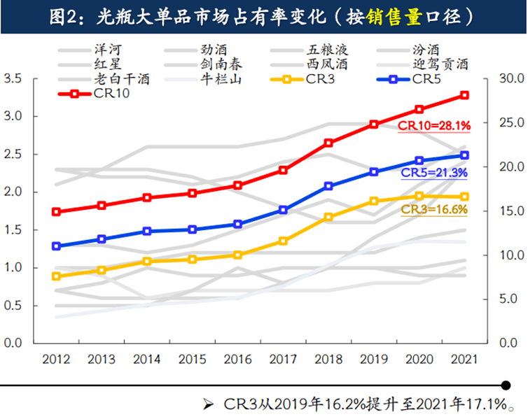 2021年光瓶酒排名前三位的市场占有率仅为17.1%,前十位占比不到30%,远低于中国白酒整体市场集中度水平。