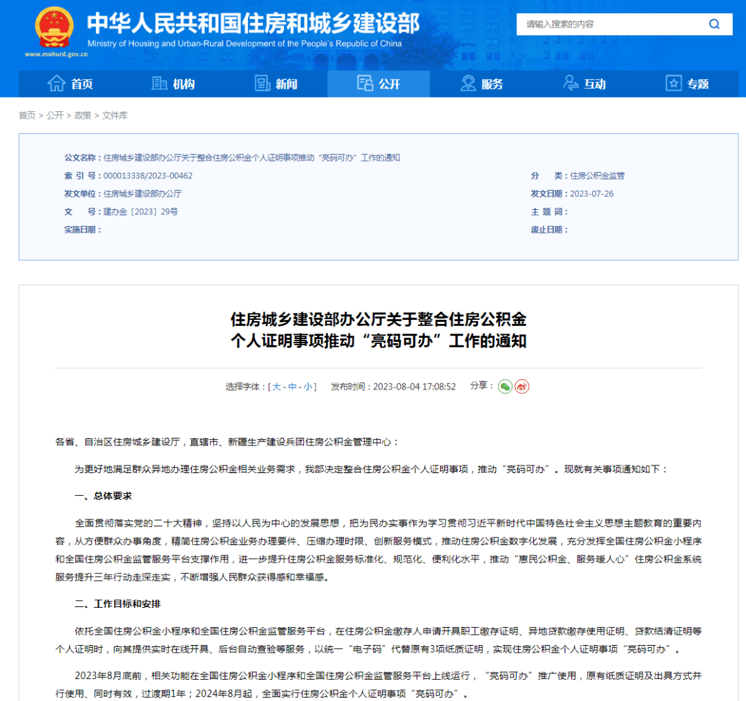通知提到,2023年8月底前,相关功能在全国住房公积金小程序和全国住房公积金监管服务平台上线运行,“亮码可办”推广使用,原有纸质证明及出具方式并行使用、同时有效,过渡期1年; 2024年8月起,全面实行住房公积金个人证明事项“亮码可办”。