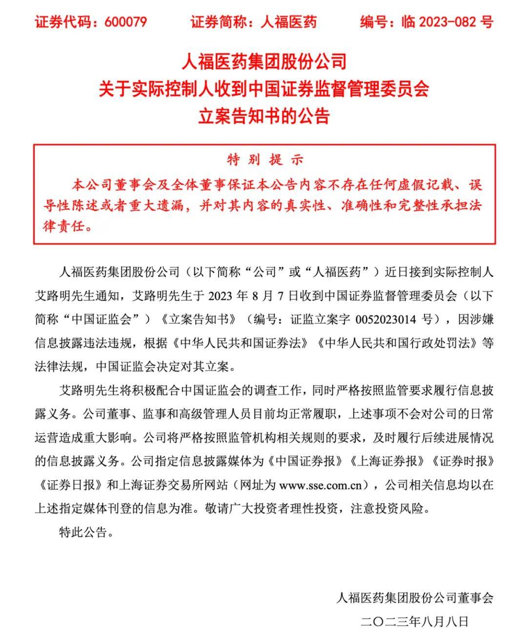人福医药也公告称,公司近日接到实际控制人艾路明通知,艾路明于2023年8月7日收到中国证监会《立案告知书》(编号:证监立案字0052023014号),因涉嫌信息披露违法违规,根据《中华人民共和国证券法》《中华人民共和国行政处罚法》等法律法规,中国证监会决定对其立案。