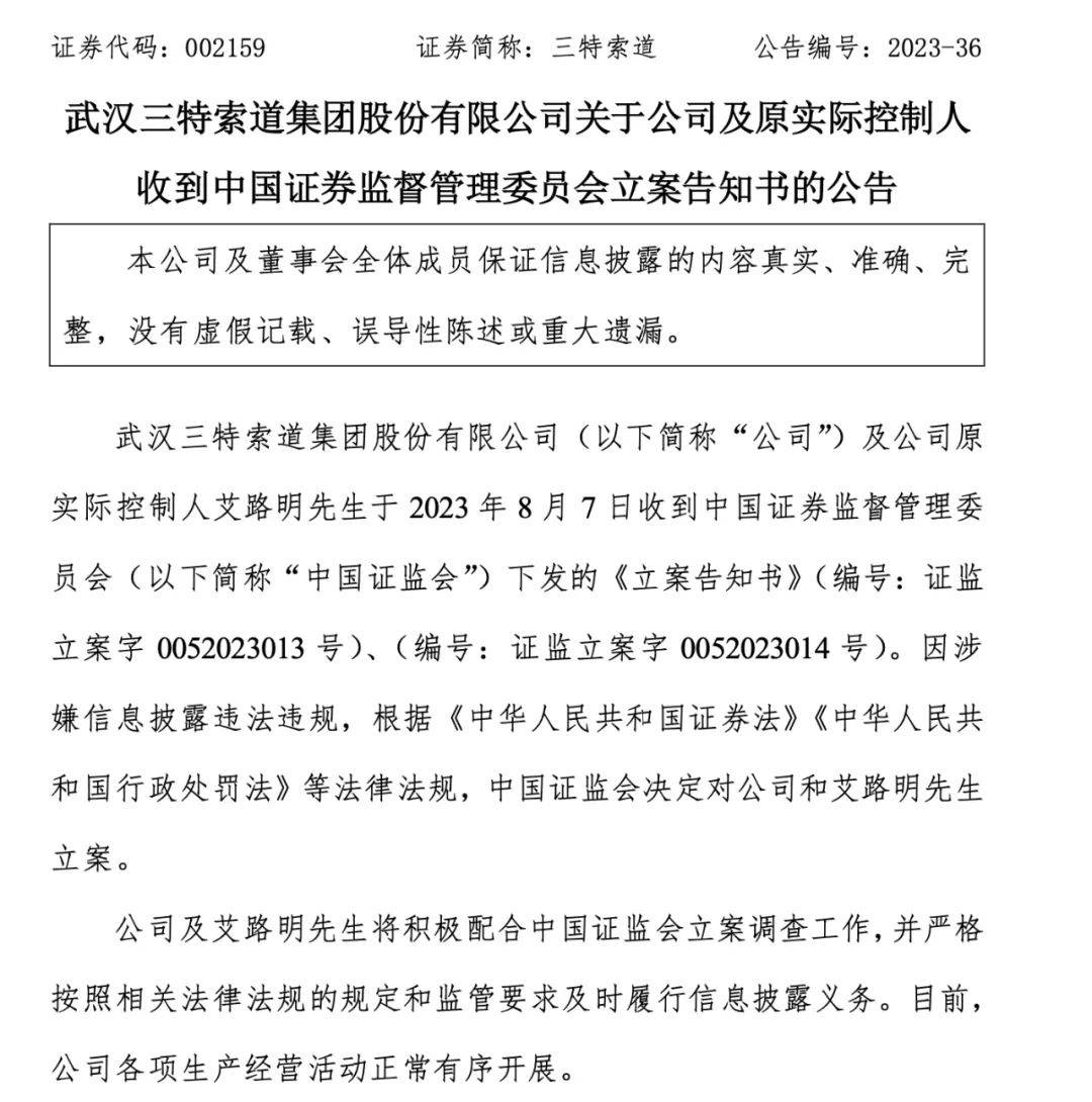 8月7日晚间,三特索道发布公告称,公司及公司原实际控制人艾路明于2023年8月7日收到中国证监会下发的《立案告知书》(编号:证监立案字0052023013号)、(编号:证监立案字0052023014号)。因涉嫌信息披露违法违规,中国证监会决定对公司和艾路明立案。
