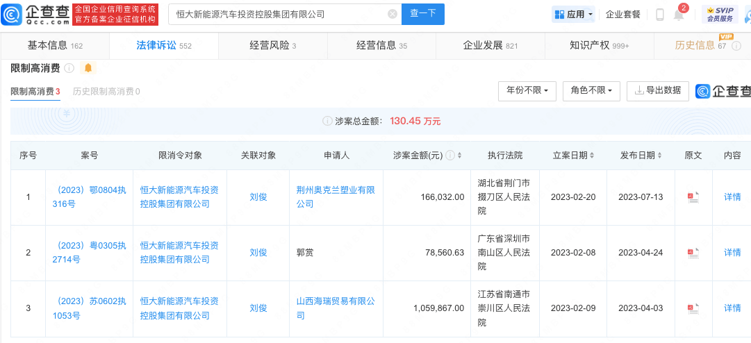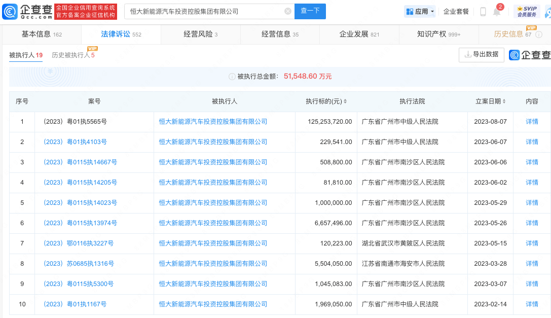企查查APP显示,近日,恒大新能源汽车投资控股集团有限公司新增被执行人信息,执行标的1.25亿余元,执行法院为广东省广州市中级人民法院。风险信息显示,该公司名下存在多则被执行人、限制高消费等信息,被执行金额超5亿。信息显示,该公司成立于2019年,注册资本35亿美元。由恒大新能源汽车控股(香港)有限公司、恒大恒驰新能源汽车(广东)有限公司共同投资成立。