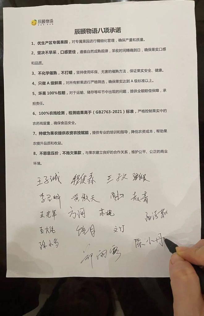 事实上,早在2016年辰颐物语就开始和广西、海南、云南等多地区的果农进行合作,除了为其赋能农资农技,提供专业的培训和指导外,还签署了“坚决不早采”“只做A级鲜果”“不恶意压价、不拖欠果款”等多项承诺。在经过多年的沉淀后,如今正式推出《承诺书》。