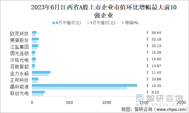 2023年6月江西省A股上市企业市值环比增幅最大前10强企业