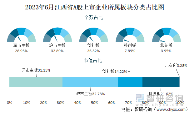 据同花顺统计数据可知:截止至2023年6月30日,江西省A股上市企业中在沪市主板上市的企业数量最多且总市值最高,共计25家企业在沪市主板上市,占全省A股上市企业数量比重为32.89%,其总市值共计2856.29亿元,占全省A股上市企业总市值比重为32.73%。