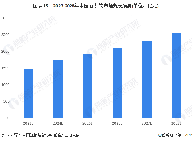 随着疫情防控政策的调整,2023年第二季度后,国民消费热情有望被点燃,2023年新茶饮的市场规模有望恢复至1450亿元,恢复三年复合增长率近20%。结合历史增长速度,保守估计到2028年我国新茶饮市场规模有望突破2500亿元,2023-2028年复合增速约12%。