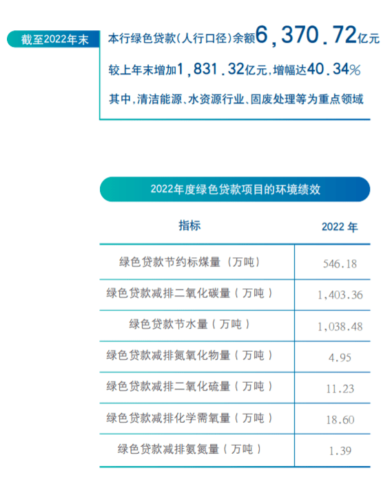 新一轮五年规划中,该行又将绿色银行作为持续打造的“三张名片”的首张,并制订了发展目标。截至2022年末,该行人行口径绿色贷款余额6370.72亿元,较上年末增长40.34%,继续保持行业领先。