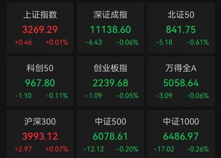 截至午间收盘,上证指数涨0.01%,报3269.29点;深证成指跌0.06%,报11138.60点;创业板指跌0.05%,报2239.68点。