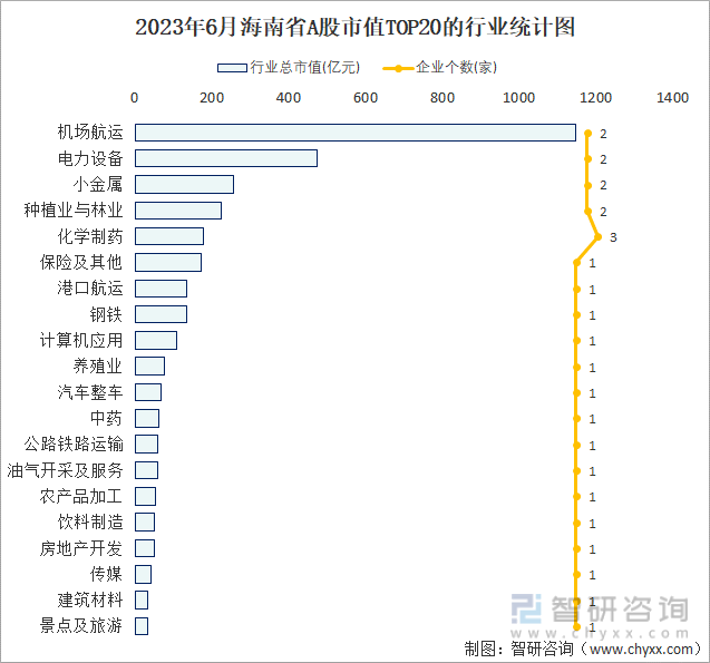 据同花顺统计数据可知:海南省的A股上市企业涵盖23个行业,其中机场航运行业的总市值最高,其总市值为1146.67亿元,占全省A股上市企业总市值比重为32.92%;市值TOP20的行业中从事化学制药行业的企业最多,共计3家,占全省A股上市企业总市值比重为10.34%。