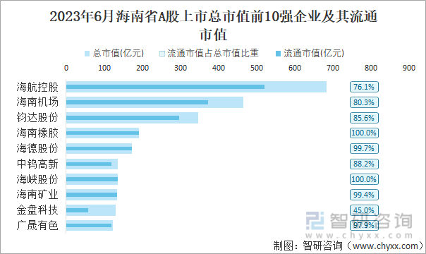 2023年6月海南省A股上市总市值前10强企业及其流通市值