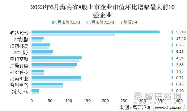 2023年6月海南省A股上市企业市值环比增幅最大前10强企业