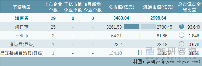 2023年6月海南省各地级行政区A股上市企业情况统计表