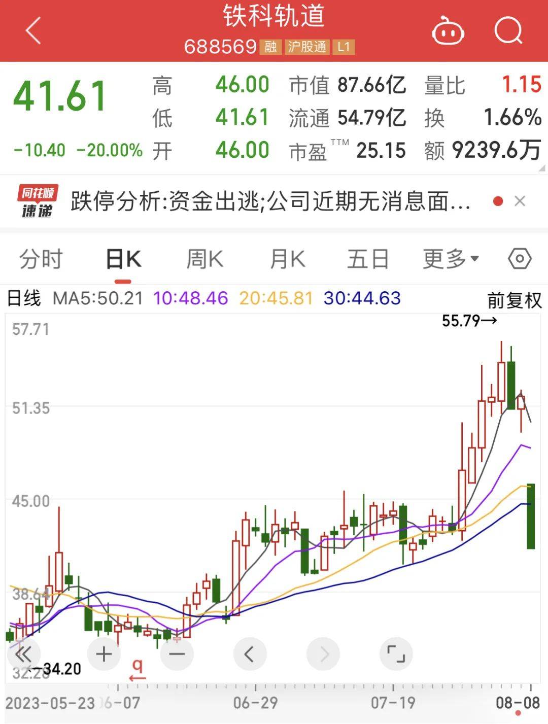 航亚科技、国光股份、铁科轨道在披露半年报后股价大幅走低。铁科轨道今日早盘股价跌停,跌幅达到20%。该公司上半年实现净利润2.24亿元,同比增长99.67%;第二季度实现净利润0.85亿元,环比减少38.88%。在本次大跌之前,铁科轨道股价表现较为强势,8月3日盘中创下历史新高,年内最大涨幅达到2.2倍以上。