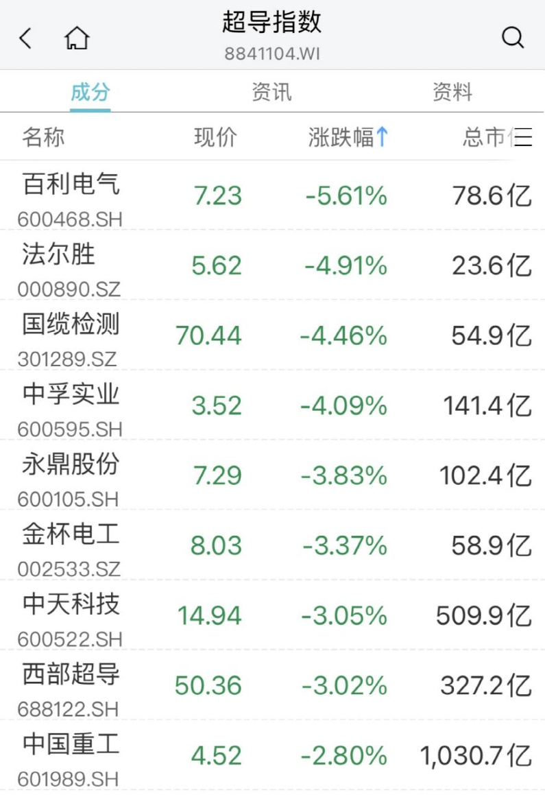 超导概念回调,法尔胜、国缆检测、百利电气跌超5%,中孚实业、永鼎股份、西部超导等跟跌。