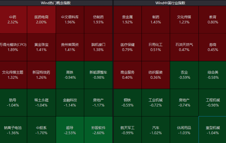 板块方面,医药股全面回暖,多股涨停,文化传媒、贵金属、光模块等表现活跃。大金融板块早盘走低随后拉升,券商股内部分化,中金公司由跌转涨,一度触及涨停,另外汽车整车、超导、航天军工等跌幅居前。