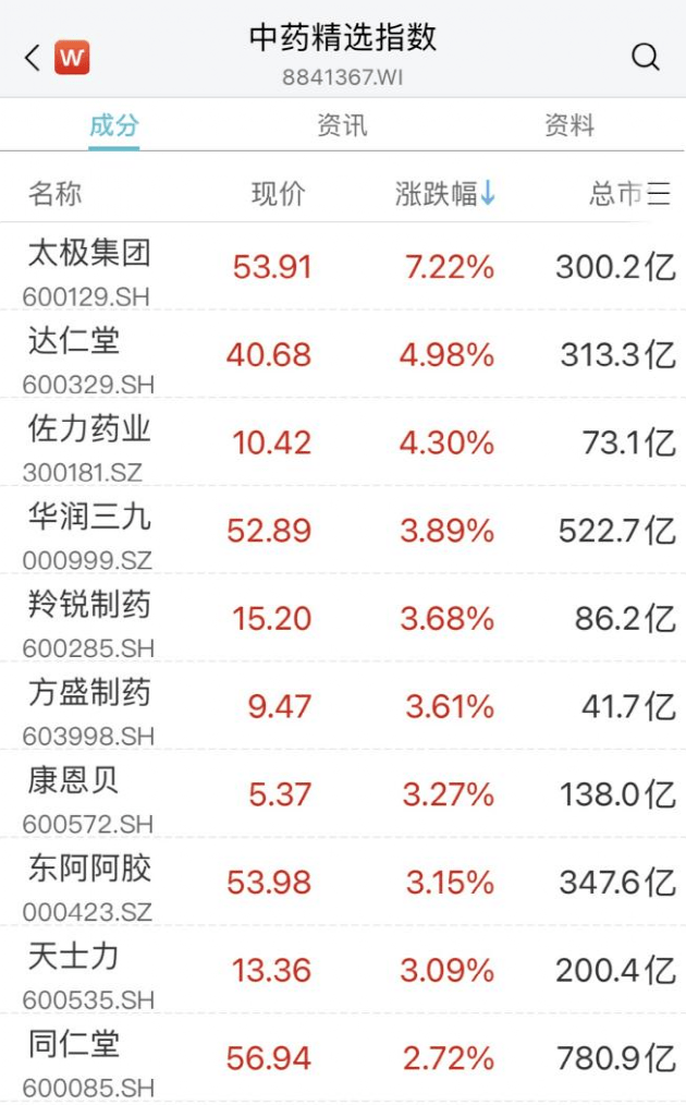 中药股直线拉升,神奇制药4天2板,太极集团涨超7%,佐力药业、达仁堂等超4%,康恩贝、方盛制药、华润三九涨超3%。