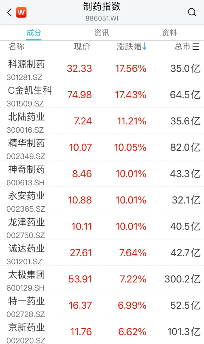 医药板块快速走高,科源制药、C金凯生科、北陆药业涨超10%,精华制药、永安药业、神奇制药、龙津药业纷纷涨停,特一药业、太极集团、京新药业等跟涨。