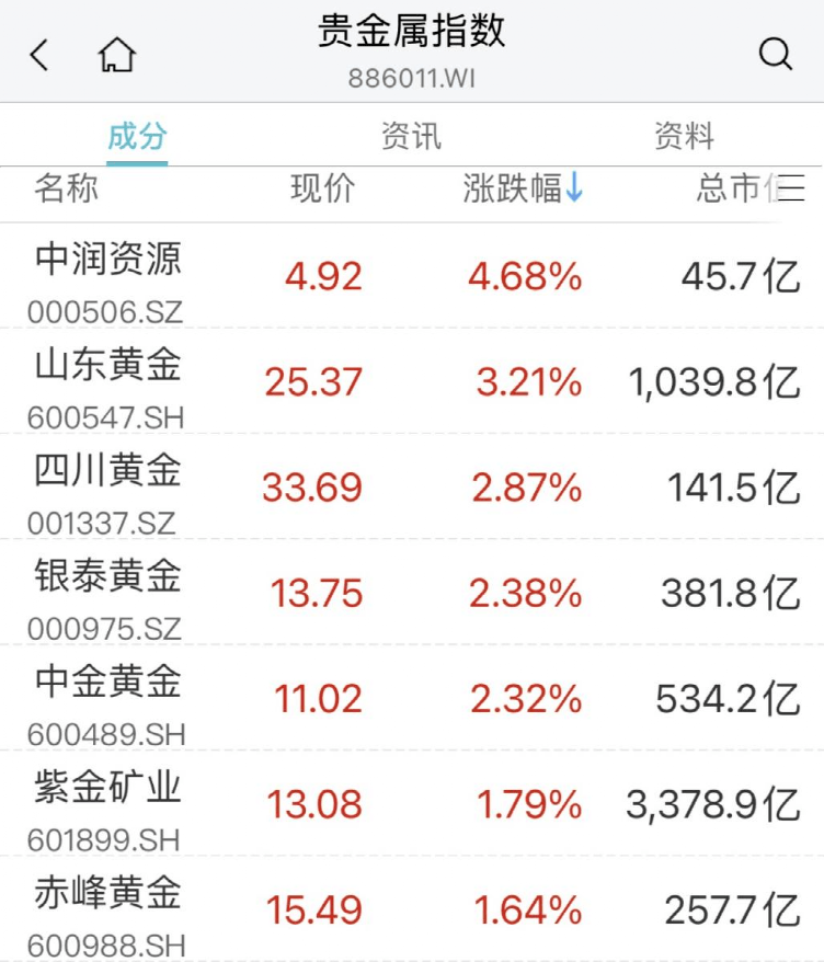 贵金属板块拉升,中润资源涨超5%,四川黄金、山东黄金、银泰黄金、中金黄金等跟涨。