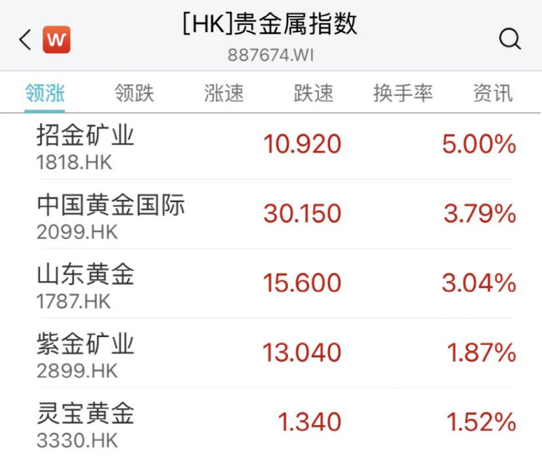 港股黄金股多数上涨,招金矿业、中国黄金国际、山东黄金涨超3%。