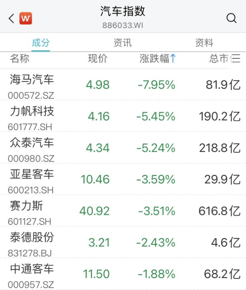汽车整车股走低,海马汽车跌超7%,众泰汽车、力帆科技、亚星客车、赛力斯等跟跌。